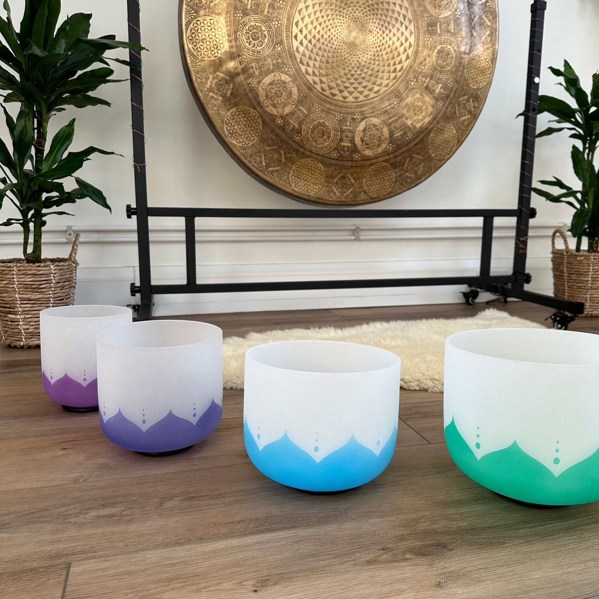 Lotus Chakra Design Crystal Quartz Frosted Singing Bowl Set
