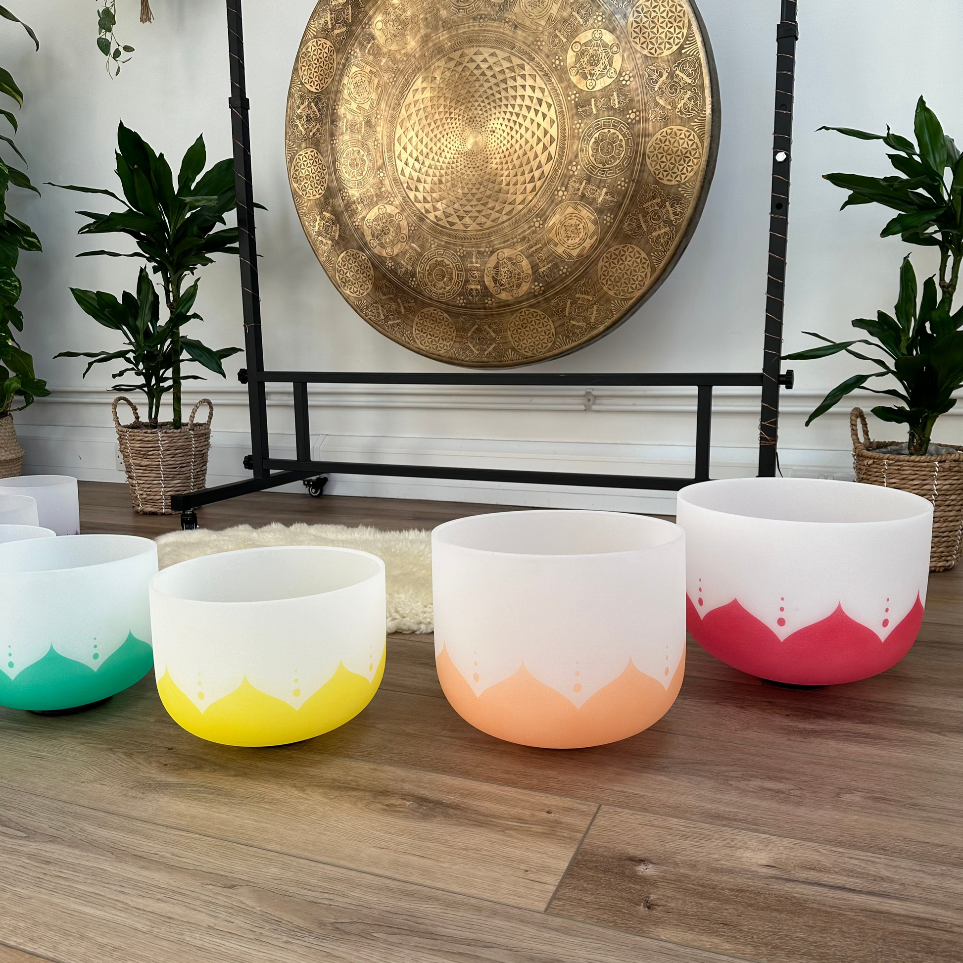 This beautiful set includes 7 Lotus Chakra Design Crystal Singing Bowls(for the 7 chakras) and ranges in bowl size from 6" to 12".